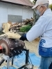 作業は朝早くから始まりました。地元で刈り取られた稲わらを使い、3本の縄のふくらみが均一になるよう注意深く編み上げていきます。わらを詰め、形が崩れないようにひもでしっかりと結ぶ作業は真剣そのもので、集中して行われました。地元で獲れた稲わらは事前に持ち込まれ、日にちをかけてしっかりと乾燥させており、当日は乾燥させたわらをまとめやすいように機械で削り、きれいに整える作業も分担して行われました。ベテランの氏子が指導し、若い世代への技術継承も大切にされています。
